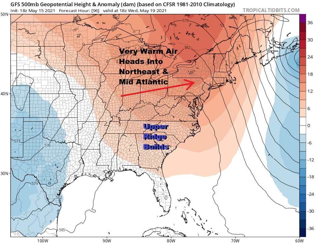 An upper ridge will be building strongly this week in the east and most importantly it is doing it west of the coastal plain. This creates a northwest flow of dry and increasingly warmer air as it downslopes from the northwest, dries out, and heats up. Today on Long Island it is another day that starts with sun and then we see it mix with some patchy clouds. We missed out on most of the scattered showers and thunderstorms that popped up inland over the last 3 days and we should miss it again today. Highs should reach the low to mid 70s with temperatures just a little cooler this afternoon along the South Shore. Overall it is a good day.