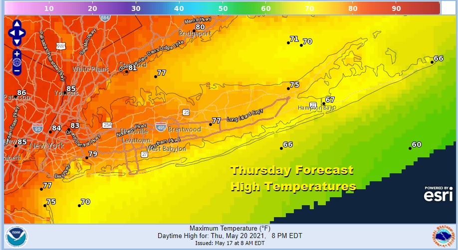 Wednesday will be the first day where Long Island could see widespread highs reaching into the 80s. I’m thinking across Nassau and Northwest Suffolk County we could see temperatures reach the mid 80s and higher than forecast by models. Even areas along the South Shore and East End could see readings close to 80 or at least mid to upper 70s before any sea breeze takes hold. It should also be another day of plenty of sunshine.
