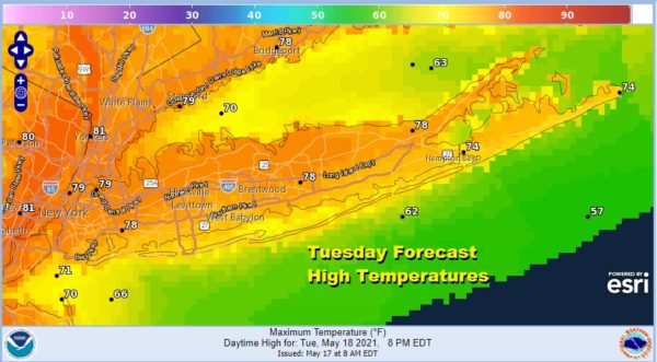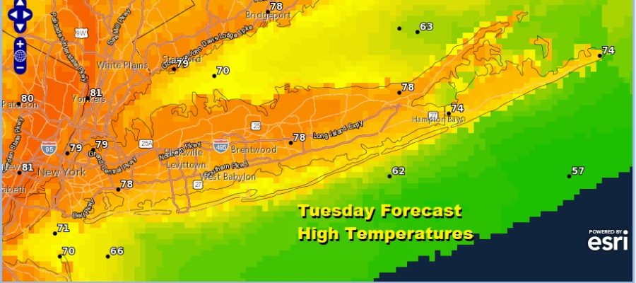 Warmer temperatures begin Tuesday and the warmest temperatures will be Wednesday and Thursday. We will also have plenty of sunshine Tuesday. Temperatures will top out near 80 degrees in most of Nassau and Northwest Suffolk County but even areas closer to the south shore should reach mid to upper 70s before the sea breeze tries to come in during the afternoon.