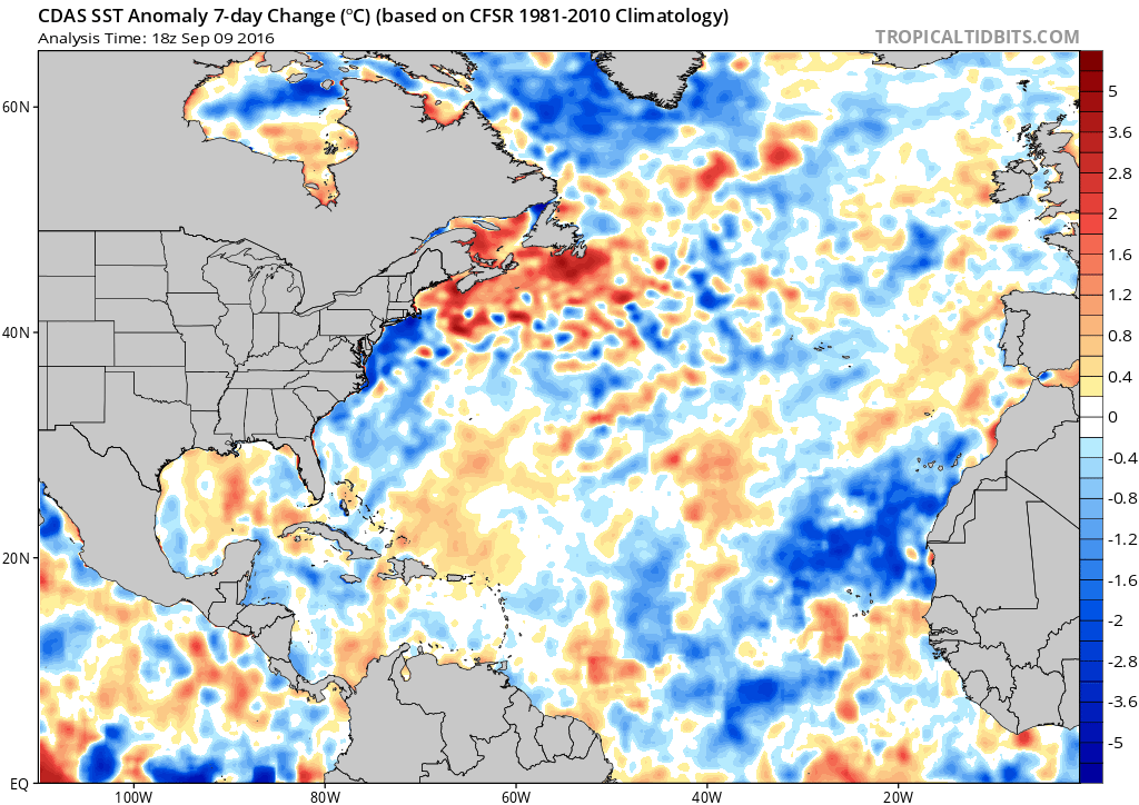 Water temperatures have dropped by more the 2 degrees Celsius over much of the Middle Atlantic & Southern Areas of the Northeast southward to off the Southeast US coast. Water temperatures have also cooled across much of the Atlantic Ocean as well.
