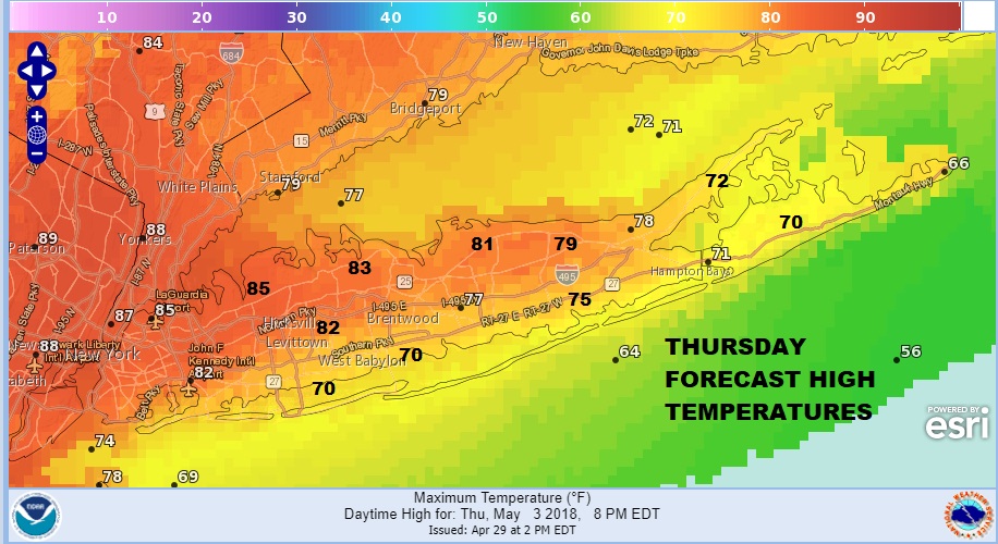 Thursday has the chance of being the warmest of the three day stretch with widespread 80s forecast even down to the South Shore areas south of Sunrise highway before any sea breeze comes inland. East End temperatures should make into the 70s again assuming plenty of sunshine.