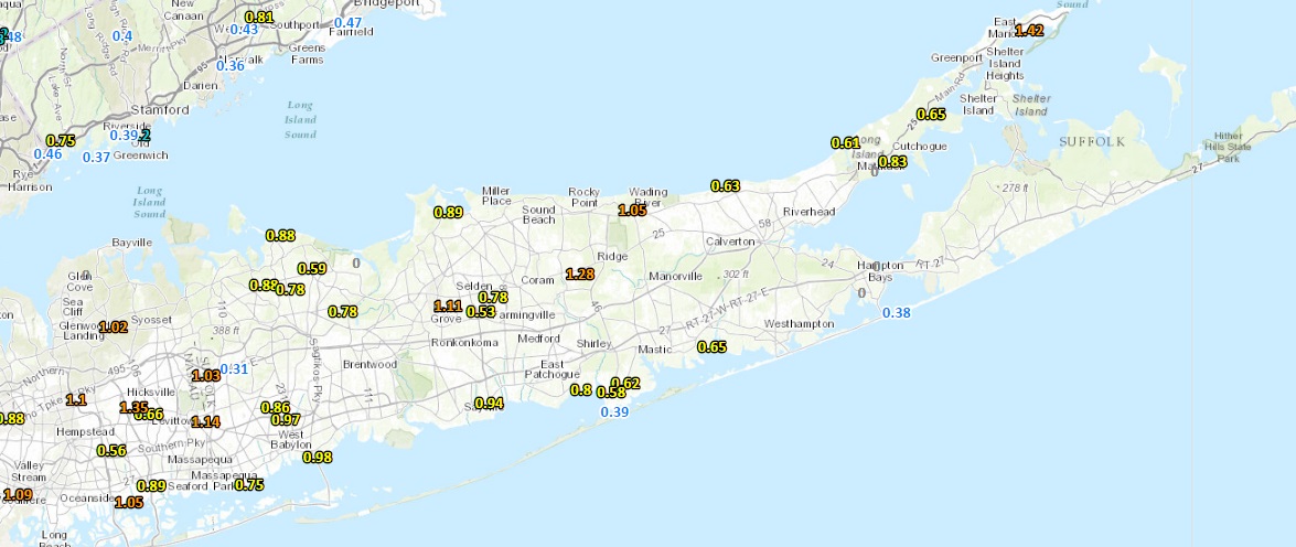 It is turned into a very sloppy Sunday across coastal areas as the cold front is combining with Post Tropical Cyclone Matthew to produce some significant 1 inch plus rains on average over Long Island. Since it may rain for a few more hours we will be adding to these totals.
