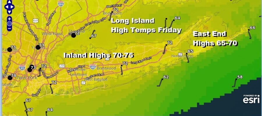 Friday’s before a holiday weekend are considered getaway day and it will a day where weather will not get in the way if your traveling. A dry cool high covers the Northeast and Mid Atlantic states and we will see lots of sunshine today. A northerly to northeast wind will keep most highs today in the lower 70s with the exception of the East End where where highs wlll be in the mid to upper 60s. There are no issues to worry about on the radar as we have dry air over head that should carry us right through the Memorial Day weekend.