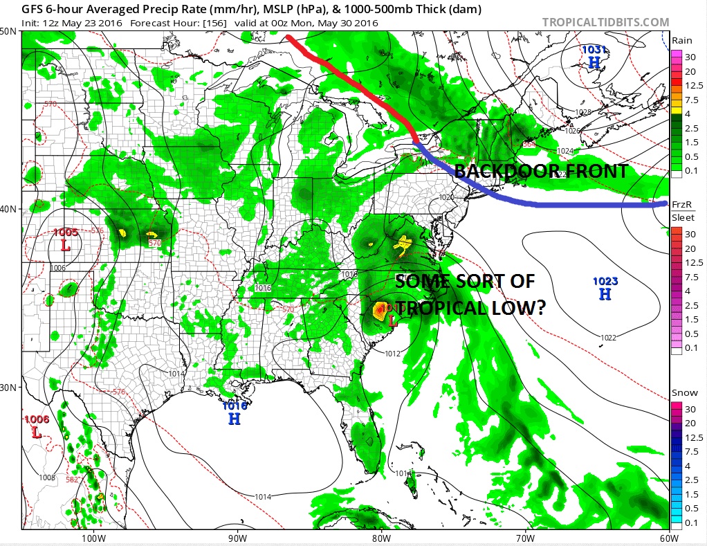 The other issue for the Memorial Day Weekend Outlook surrounds the development of low pressure east of the Bahamas that moves northwestward. Weather models are all over the place with this and given the time of year it is always possible that this could be some sort of tropical system though the time of year would argue against that. We will of course keep a watch on this as the week progresses. It should be noted that the Euro model is slower and develops the low much later in the forecast period. It also does not show a well developed backdoor front like the other models do. For now we will be optimistic on the overall weekend until we see how this all winds up playing out.