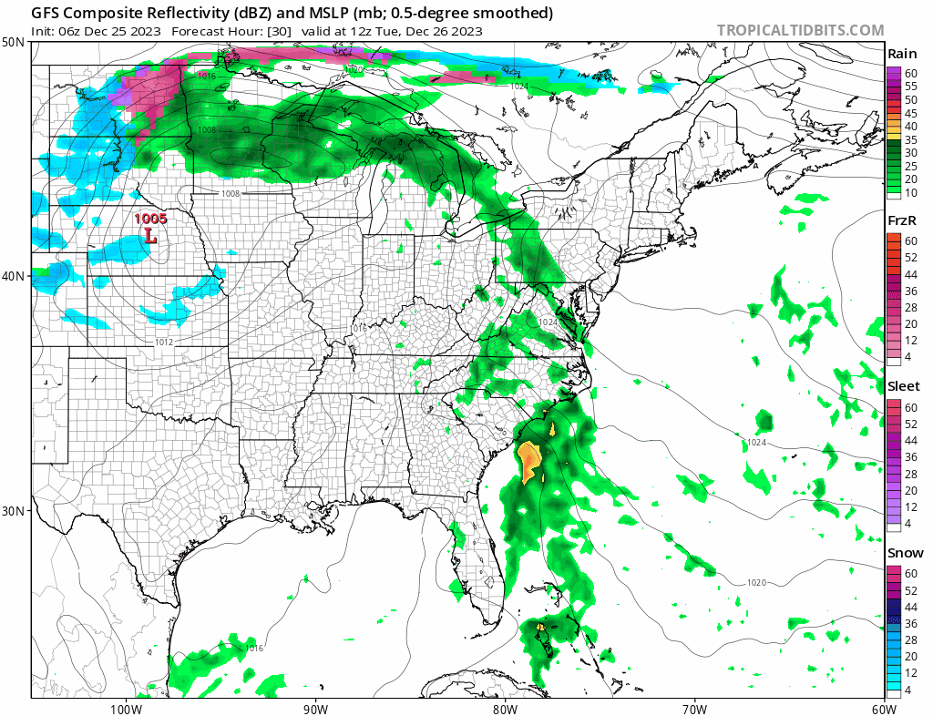 The lead band of rain will weaken as the front heads east so we don’t expect any rain Tuesday unless an odd shower develops in the southerly flow. Tuesday highs will again be in the upper 40s and lower 50s. Tuesday night and Wednesday as a new low forms on the front along the Mid Atlantic coast, rain will develop and spread northward and we will see rain overspread Long Island Tuesday night and Wednesday. Highs Wednesday will be into the 50s. The low will head to the northeast and the rain should end Wednesday evening. Thursday we see leftover clouds with highs into the lower 50s. We will begin to gradually step down in temperatures by Friday when we will be in the 40s. It should turn colder over the weekend. Whether we get another round of rain Friday will depend on whether another offshore low forms but for now we will leave it just as a cloudy Thursday night and Friday and revisit the rain chances in the coming days. Merry Christmas to all and enjoy the holiday!