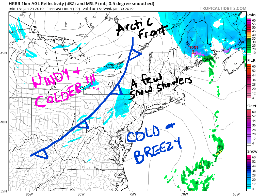 The top story for us is easily the wicked cold blast we will be getting in the coming days. Wednesday will be cold and breezy, with highs around 30 and wind chills in the teens. A few snow showers are also possible as a weak arctic front passes by, but that will plunge us even further down come nightfall.