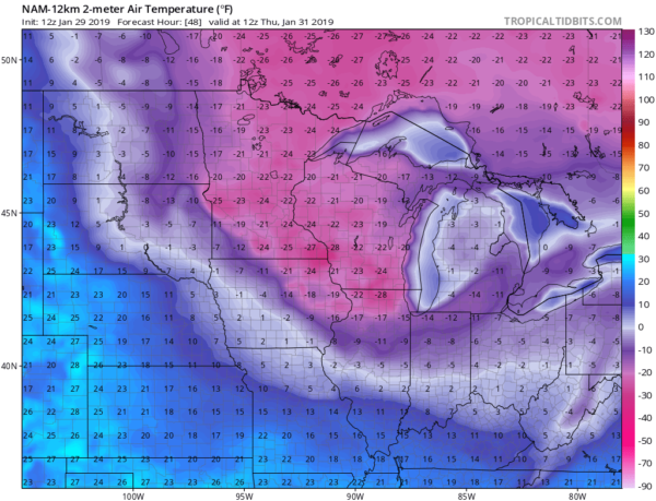 Thursday afternoon highs won’t escape the teens, but Friday will much less harsh as we head into February. Winds will die down and highs will reach the 20s. The weekend will feel significantly better as we make it back to the freezing point on Saturday and return to the balmy 40s for Super Bowl Sunday. Less than 50 days until spring! –Geoff