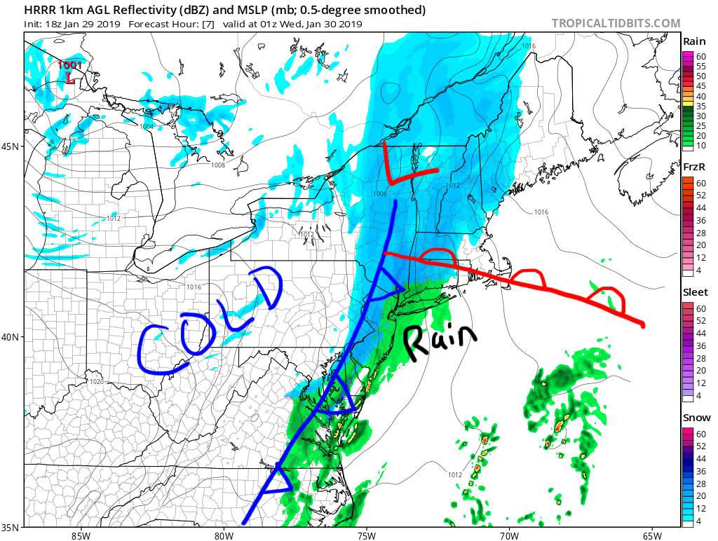 A weak system has reached NYC this afternoon, bringing light snow to points west. With temperatures now around 40 degrees for the city on east, that light snow will change to light rain as it overspreads the island this evening. As the system departs overnight, colder air moving in will briefly change the rain back to snow. This could lead to a grassy coating at best for us. Yet another unimpressive “snow” event.