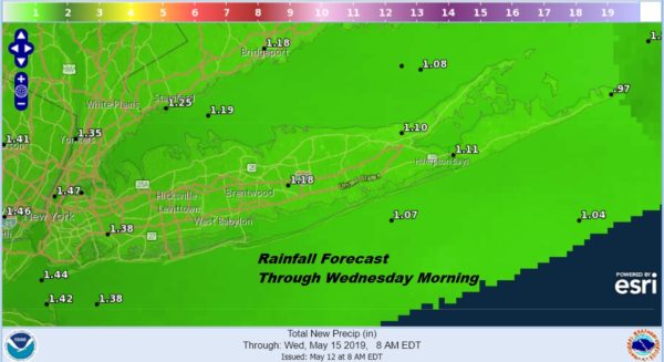 Tuesday brings a break to the continuous rain but there still could be a few more showers scattered around and the same holds for Wednesday. At least we should see a bit of a recovery in the temperatures come Tuesday and Wednesday and there is the chance we could see some breaks of sun appear from time to time. But as far as general improvement and a couple of days of wall to wall sunshine that doesn’t appear to be in the cards for this week at all. Rainfall amounts for Long Island will be in the inch to an inch and a half range spread out over the next 48 hours which should be manageable other than puddles.