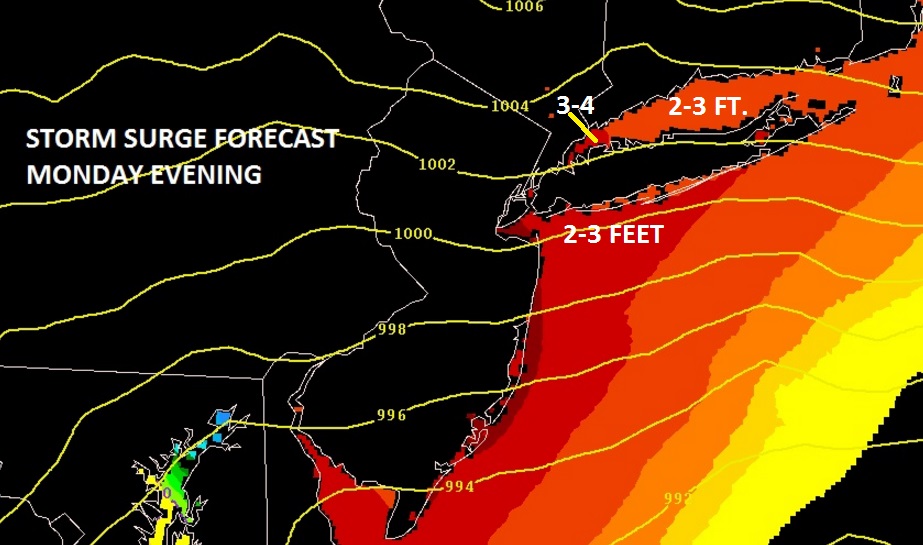 As far as the tides are concerned here is the latest surge forecast from the National Weather Service. Tides will run 2 to 3 feet above normal at high tide Monday with 3 to 4 feet possible in Western Long Island Sound.