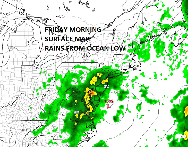 By Friday morning the low is off the Delaware coast. You can see how the Nam model arcs the heaviest rain to the west and south of Long Island but we are in it.