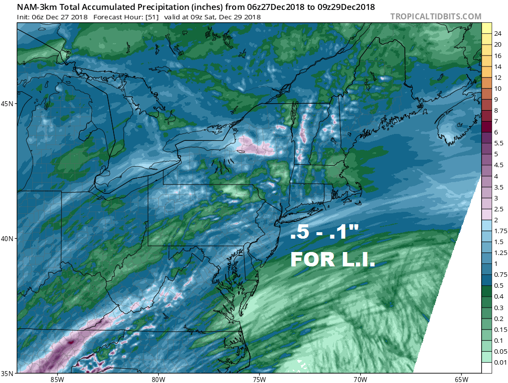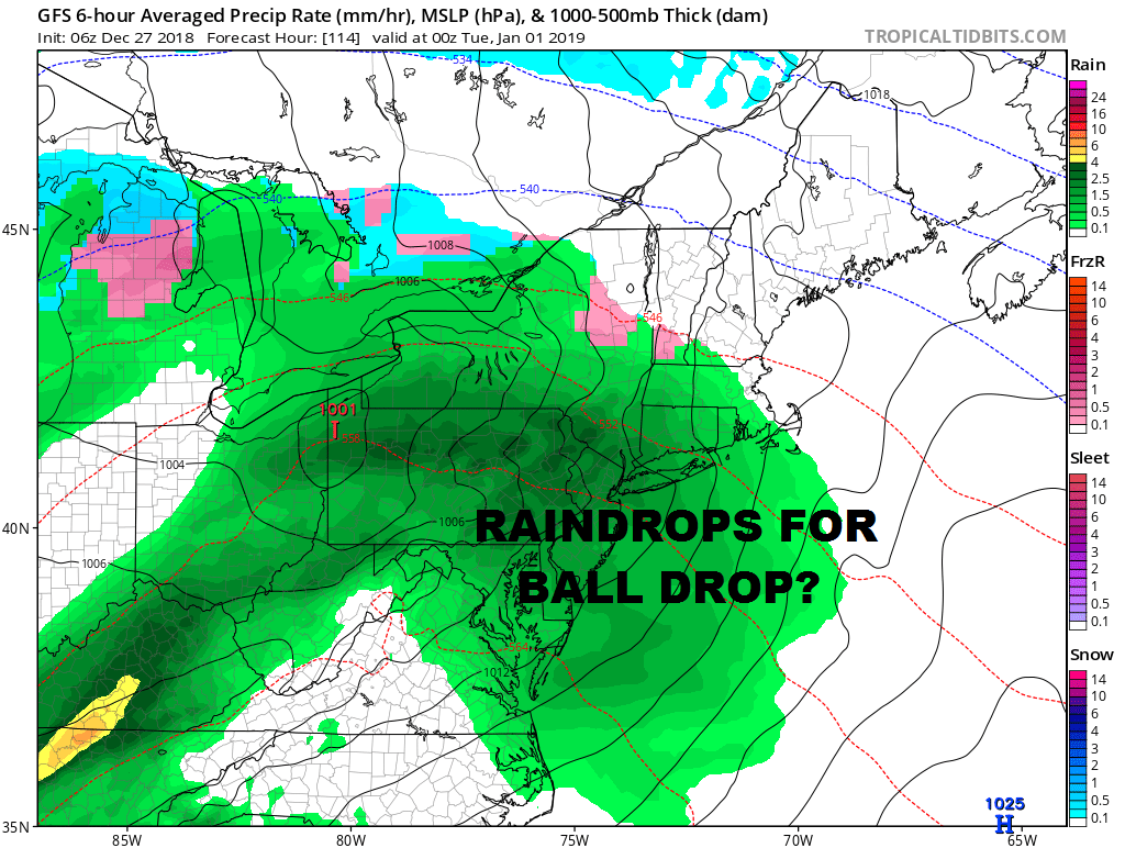 That rain may linger into the first hours of the New Year, but my current forecast for New Years’s Day is mostly cloudy, with highs in the 40s. This active pattern will continue later into the week and with colder air eventually coming back into play we will need to be on the lookout. The Euro is still hinting at a big storm nearby heading into the first weekend of 2019. –Geoff
