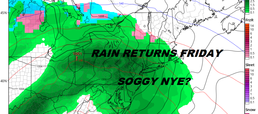 Skies will clear Friday night and the sun will return on Saturday, but colder air will come rushing back in. Temperatures will fall through the day: 50s in the morning, 40s for the afternoon, and 30s by the evening. Sunday will be a cold day, but it is now looking dry. A wave developing over the Tennessee Valley looks to run to our south as a very cold high builds in from the north. We may be spared for Sunday, but another storm develops on New Year’s Eve Monday. This one looks to come up to our west, which means rain and not snow. Should the system reach us early enough on Monday or even Sunday night however, there could be some sleet or freezing rain concerns for parts of the area.