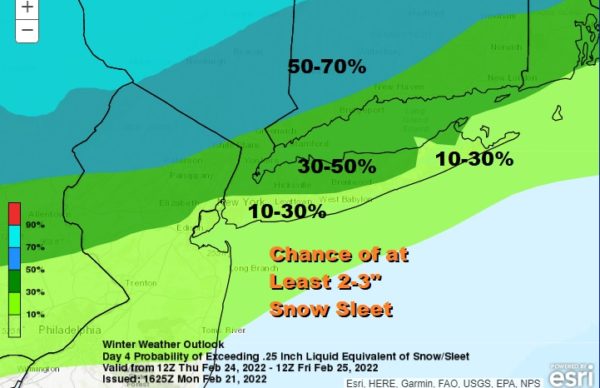 During Thursday night we will see sleet/snow that will probably change to all snow for awhile. The low will try to redevelop to the east off the Delaware coast but it will probably not do it fast enough to prevent an eventual change to rain. However there may be enough time to put down up to a few inches of snow/sleet. The Weather Prediction Center is forecasting a 30 to 50% chance on the North Shore and 10 to 30% on the south shore. Precipitation will end Friday morning with leftover clouds and highs in the 30s. We will have to wait to see if we see a colder look develops and that could prolong snow and sleet. We probably won’t know that until Wednesday or Thursday. While the weather improves Friday into Saturday the active pattern isn’t done yet. another low will be heading up the coast just offshore on Sunday so there is the chance for some snow Sunday afternoon into Sunday night.