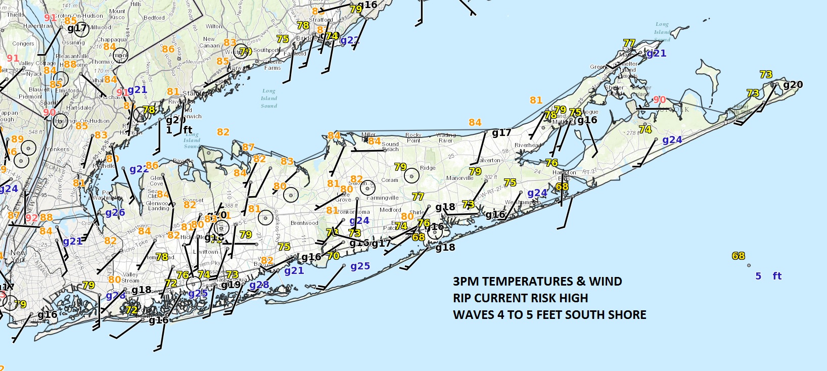 With the warm humid air covering Long Island it is being fed by a strong south to southwest wind. This began yesterday and continues today creating strong rip current conditions all along the South Shore or Long Island. That condition continues into this evening and through the day Saturday. Rip currents should relax a bit on Sunday as the south southwest wind shifts to a more westerly wind.