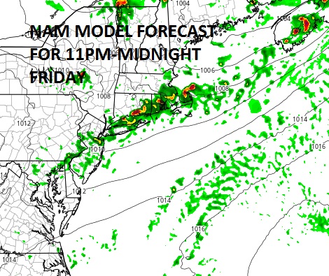 The NAM model is showing a broken line of thunderstorms moving through between 11pm and Midnight Friday night. It does not show much in the late afternoon or evening. Frankly the dynamics are not impressive though they may favor stronger thunderstorms (if they happen) over Central & Eastern Long Island and less to the west. The Storm Prediction Center has Long Island at a marginal risk for severe weather Friday evening.