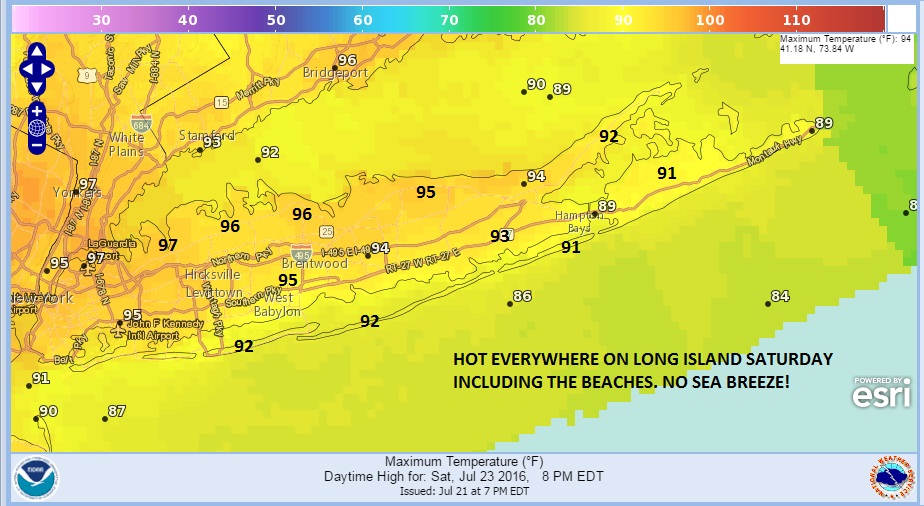 Saturday will be the hottest day this weekend and with a northwest wind there will be no sea breeze so temperatures will be in the 90s even at the beaches. The sea breeze will probably not be a factor so the beaches will be rather brutal unless you cool off in the ocean.