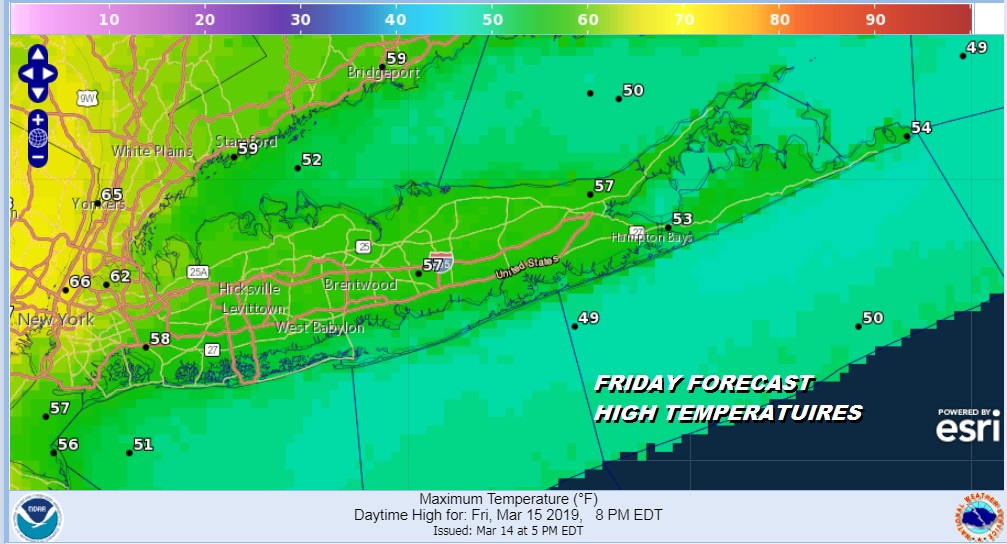 The south wind will become more southwest during Friday which will allow temperatures to get a little higher but we will still be about 10 degrees lower than places to the west. Highs could reach the 60s in Northern Nassau & Northwest Suffolk County briefly before easing back. Some showers will probably come through late in the afternoon and evening but we don’t expect anything other than a few showers with perhaps a brief heavy downpour.