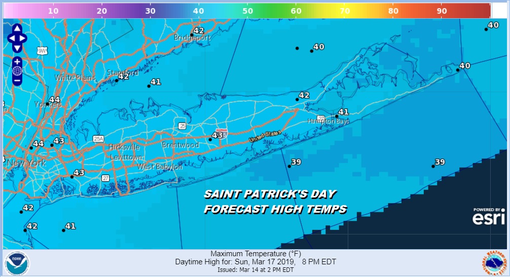 Saturday brings sunshine and some clouds along with a gusty northwest breeze. Highs will be just into the 50s. Colder air will bring temperatures down into the upper 20s and lower 30s Sunday morning under clear skies. Sunday Saint Patrick’s Day will be sunny but cold. Highs will just be in the lower 40s at best so dress warm if you are head out for the Rocky Point Saint Patrick’s Day Parade. It might be on the breezy side for awhile Sunday but winds should ease a bit later in the day.
