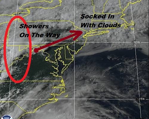 We remain socked in with clouds this evening and we did have a few showers go by this afternoon. Those are now to the east. Meanwhile to the west we see an area of showers and thunderstorms in West Virginia and Western Pennsylvania moving eastward. This is our rain for overnight into early Saturday morning and it should be on the order of a quarter of an inch or so. There is the outside chance for a thunderstorm. This does not look like a widespread rain event for overnight.