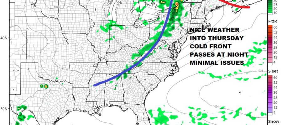 The next cold front approaches Thursday but it should not be a problem dayside. Look for sunshine and some arriving clouds in the afternoon. Highs should reach the low 70s. This front appears to be weak and I’m not expecting much from it as it goes by. Slightly cooler weather will follow Friday and into the weekend. Another front will approach late Sunday but here too, the front looks to be weak and it could pass through dry. No major storms are on the horizon and the tropics have gone dead for now.
