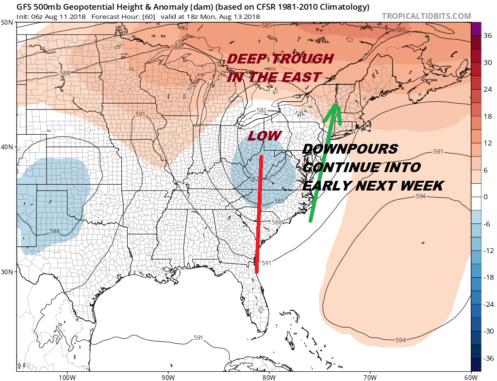 This pattern will continue through Tuesday and then the upper low to the west will get kicked out on Wednesday. Weather conditions could improve somewhat after that but the threat for downpours and thunderstorms will be in the forecast pretty much all next week.