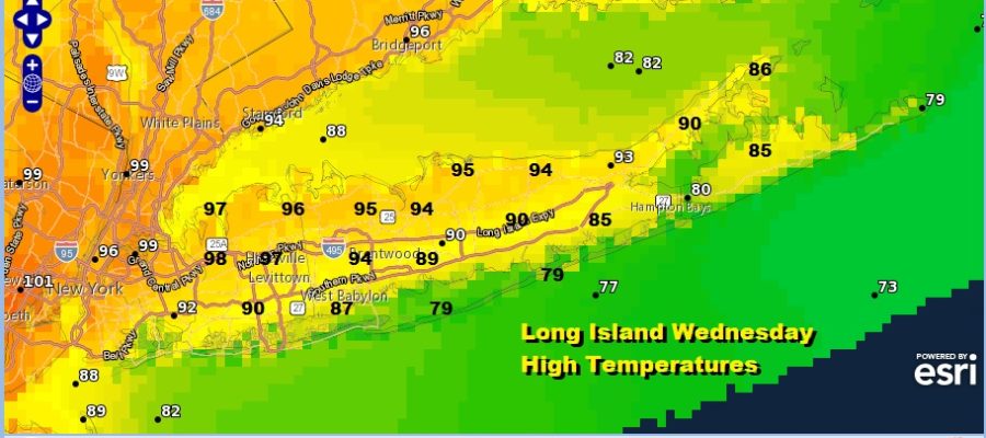 Today marks the last day of 90 degree plus highs for Long Island. Not all areas have been seeing highs in the 90s the last few days. In fact Islip only reached 88 degrees for a high yesterday and South Shore and East End areas have fared a bit better during this 3 day heatwave. Inland Nassau and Northwest Suffolk County have seen temperatures reach 90 to 95 and that will again be the cast today.