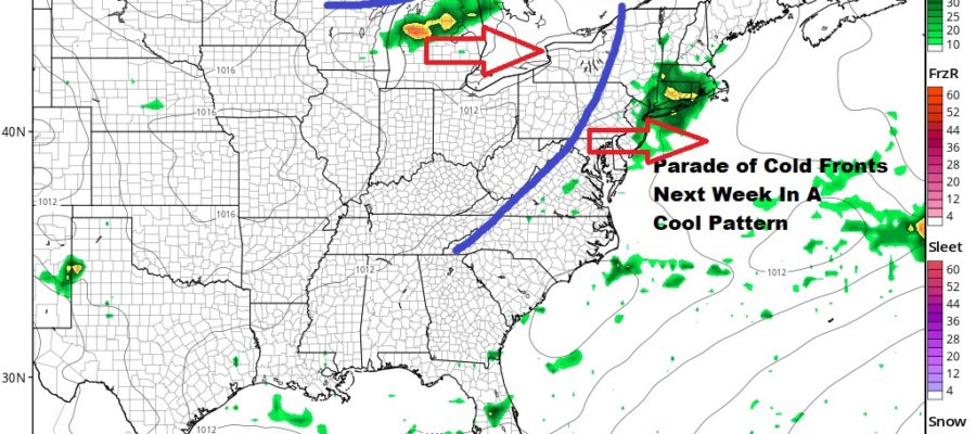 Sunday night brings a series of weak cold front through Long Island. We could see some showers or a thunderstorm when the front passes during the early morning hours. Monday we will have partly sunny skies and highs again will be in the 70s with reasonable humidity. The frequency of weather systems moving through is thanks to a strong northwest flow in the Eastern US that will be with us all week. It can’t get hot or humid because there is little time between frontal passages. Another chance of a shower or thunderstorm is there for Monday evening. The front will likely get hung up for awhile offshore but it should be far enough east to prevent any serious issue. Tuesday will be partly sunny again with highs in the mid to upper 70s. High pressure builds in for Wednesday and Thursday so it is more of the same, partly to mostly sunny skies and highs in the 70s. It looks like an uneventful week but at least there is no heat and humidity to deal with for 7 days or so.