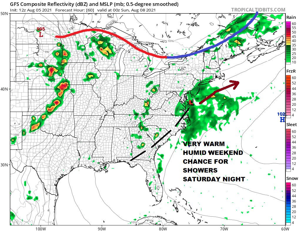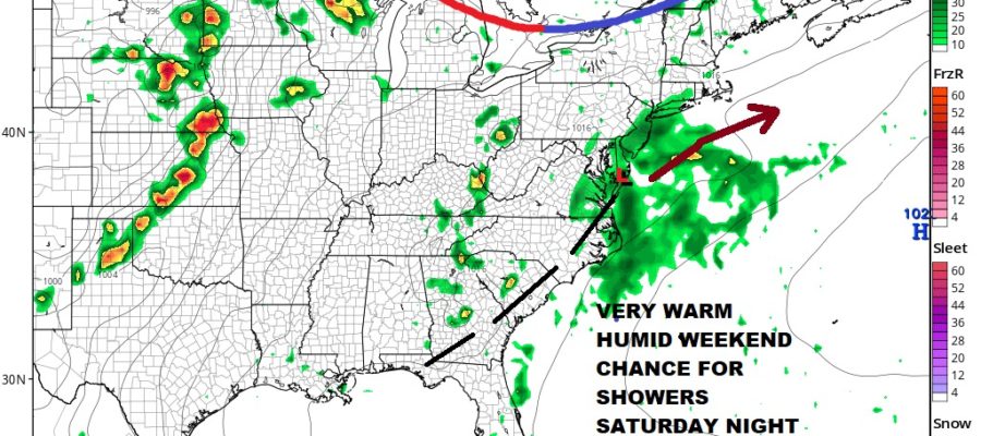 Saturday will be a very warm and humid day on Long Island with sunshine and some arriving clouds. A low with a weak upper air disturbance will be moving northeast up the coastal plain Saturday and then passes south of Long Island Saturday night into Sunday morning while a backdoor cold front heads southward and weakens. Highs Saturday will be in the upper 70s at the shore to some middle 80s inland. We could see some downpours or a thunderstorm overnight into early Sunday morning and then the sun should come back with very warm and humid conditions and highs in the 80s.