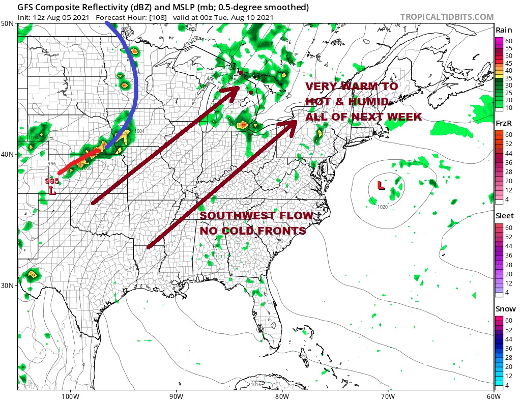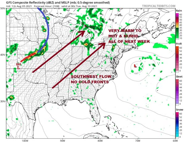 Next week is rather straight forward in that we have a ridge along the East Coast and little chance for any frontal passage until late in the week at the earliest. So for Long Island it is a week to think about the beach or the pool as each day will be very warm to hot and humid with sunshine and just a small chance (if any) for a pop up shower or thunderstorm. Each day highs will be in the mid 80s to near 90 degrees inland and in the 70s to near 80 at the beaches. The Dog Days of August are here!