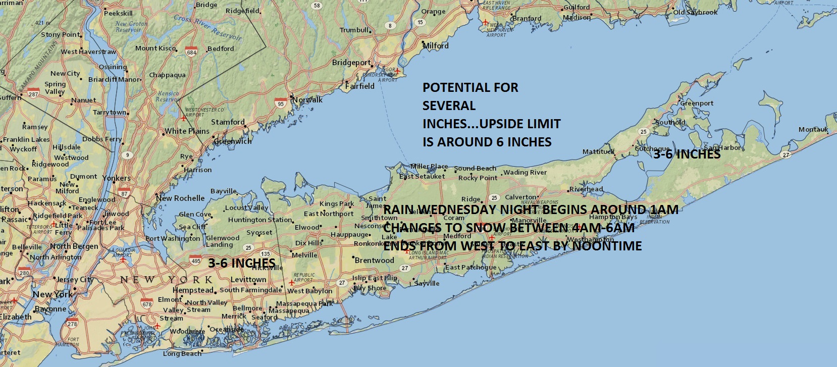 Right now and unlike prior snows of this year, I have Long Island as part of a wide banded area that has the potential for several inches to as much as 6 inches and that area extends northward into the Hudson Valley and Southward into Central New Jersey. Snow could wind up being equally distributed from west to east. Right now the confidence in this forecast is LOW and will be reevaluated in on Tuesday. Regardless we will see very cold temperatures here Friday morning with lows in the low to mid teens especially if there is a snow cover on the ground. Friday we will see sunshine give way to arriving clouds with highs in the 20s. Then some snow is possible again Friday night into Saturday morning as a warm front goes by to our north.