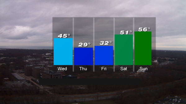 Once this storm system moves through tonight, they will drop into the 40s, where they will remain through the end of the week (30s overnight). It will be dry through Friday, with varying amounts of sun and clouds.
