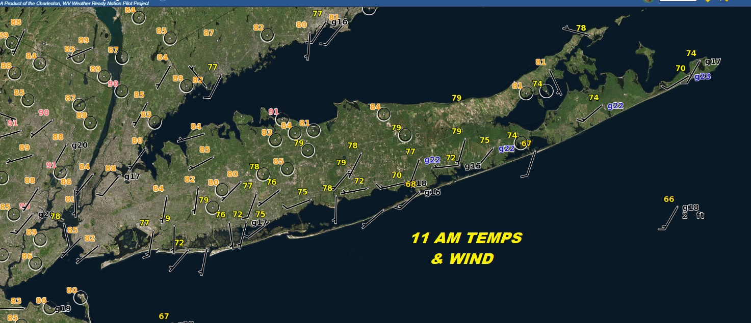 Long Island is catching a break from the 90 degree plus highs that will occur later this afternoon to the west. The south wind has been blowing all day and that has kept temperatures in check. North of the Long Island Expressway as of 11am we see temperatures are into the 80s but on the lower end verses the higher end. South of the Expressway temperatures have been holding in the 70s to near 80. The south wind off the 60 degree ocean is doing a good job of keeping temperatures down. Highs will reach the 80s in many areas but it seems that except for prehaps northwest Nassau County most of the Island will stay under 90 degrees and much of the South Shore and East End will be in the 70s.