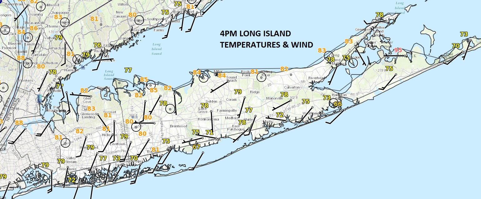 We are enjoying a beautiful summer weekend on Long Island with lots of sunshine but we are also seeing the spring sea breeze work its way inland late this afternoon. Temperatures to the west across New Jersey to NYC & the Hudson Valley are in the low to middle 80s while here on Long Island that south southwest wind is cooling temperatures off everywhere except right along the North Shore where it is in the 80s at 4pm. Everywhere else we have dropped into the 70s and even some 60s are now showing up right along the beaches on the South Shore. The cool off will continue into this evening and other than a few passing clouds there are no serious issues. Some specks of showers are popping up on the local radar below to the north and west but for now they are few and far between. Unless one sneaks in this evening, there are no worries weather wise for tonight.