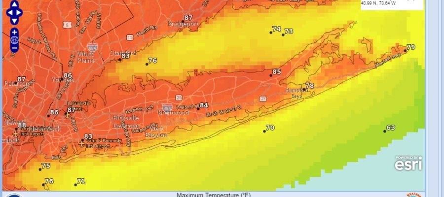 Temperatures Wednesday afternoon will reach the upper 80s to near 90 in Northern Nassau and Northwestern Suffolk County. Even the beaches will reach the low to mid 80s.