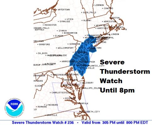 A Severe Thunderstorm Watch has been issued for Nassau County west into NYC and points west until 8pm. Usually this is the point where we say that thunderstorms heading for Long Island will fall apart before they get there and most times that is true. This is one of those times where it won’t be. The radars are showing strong to possibly severe thunderstorms coming out of Pennsylvania and moving across Northern and Central New Jersey.