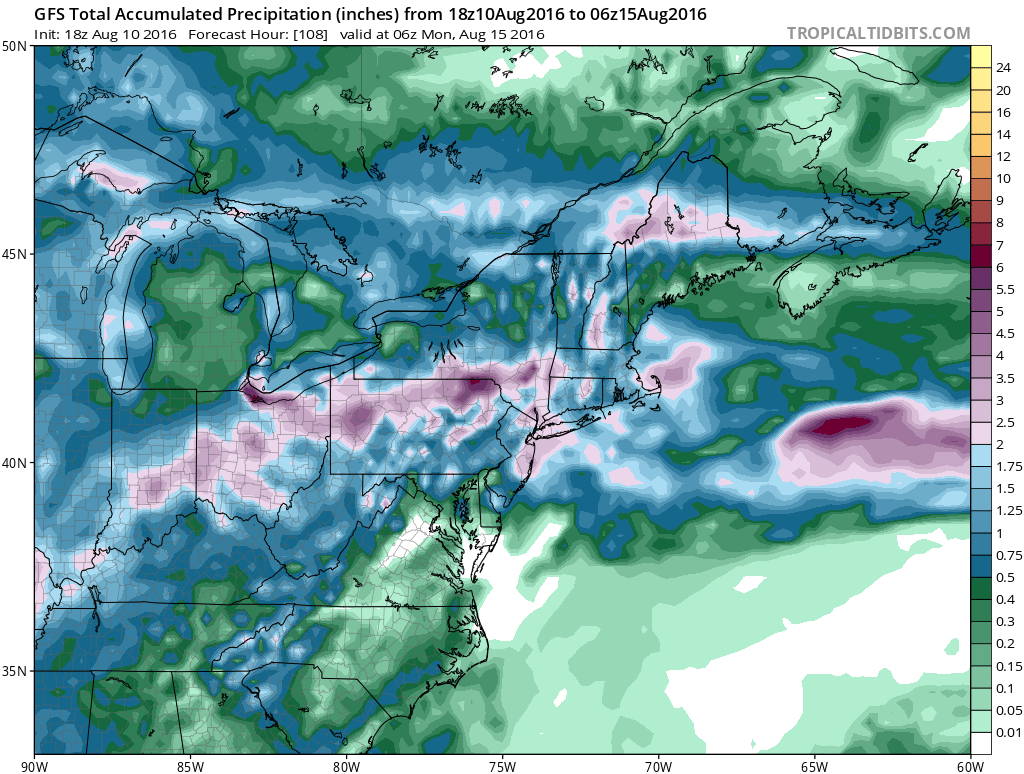 Satellite loop shows some showers and thunderstorms tonight moving across Pennsylvania. Whether they survive the night remains to be seen but over the next several days we will see some showers and thunderstorms popping up from time to time and place to place. Some of the rain could be heavy in some storms. The rest of the time and the majority of the time will be very warm and humid right into Saturday with highs each day in the mid to upper 80s and nighttime lows in the 70s.