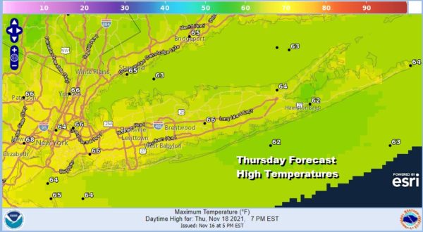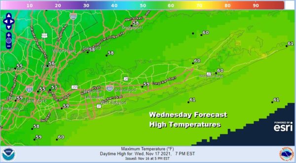 Wednesday should be no worse than partly sunny and with a nice southwest breeze developing, temperatures during the afternoon should reach the upper 50s to around 60 degrees. Some patchy clouds could roll in from time to time but that should be the only minor issue.