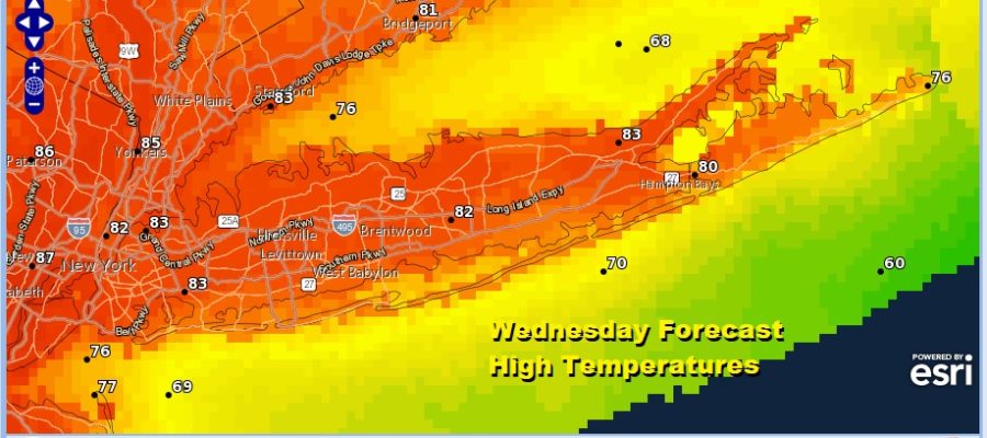 Areas in Northern Nassau and Northwest Suffolk County should see highs reach the low and middle 80s. Even the South Shore and East End will see highs reach above 80 before a sea breeze eventually develop. That sea breeze will likely work its way inland after 4 or 5pm and bring temperatures down especially in the eastern half of Suffolk County.