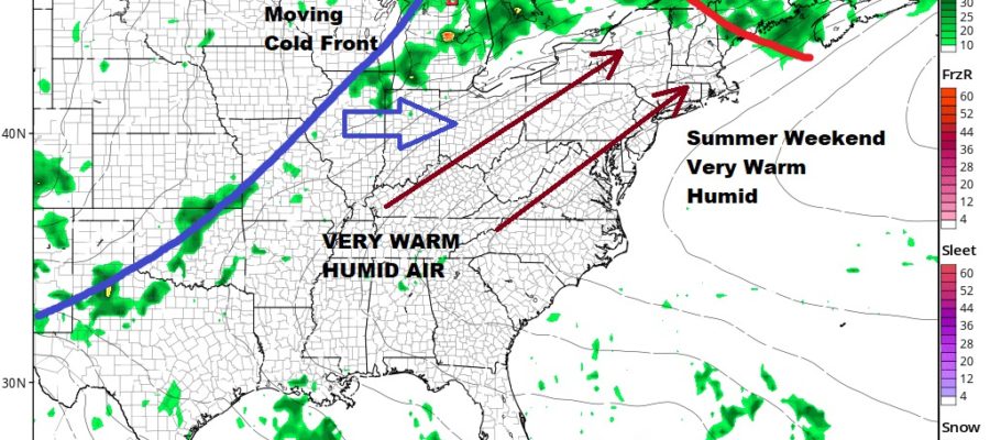 The weekend is straight forward from a forecast stand point. It will be very warm and humid both days. We should see no worse than partly sunny skies. I’m going to mention the odd chance for an isolated shower or a thunderstorm but there is a very good chance you won’t see a thing all weekend. Saturday’s highs will reach 80 to 85 inland and 80s at the beaches and over the East End. Sunday highs will be in the mid to upper 80s inland and near 80 shore and east.