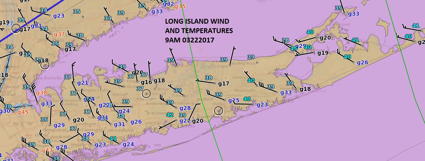 We are seeing strong gusty winds across parts of the area and a wind advisory is in effect for Long Island today, Winds will gust to 30-40 mph at times today and run sustained 20 to 30 mph from the northwest. Temperatures this morning are in the mid to upper 30s but with cold air advecting from the northwest temperatures are likely to just hover in a tight range of upper 30s to lower 40s with the wind making it feel like its down in the 20s. The satellite loop shows mainly clear skies although there are some clouds upstream that could move through here later this morning.