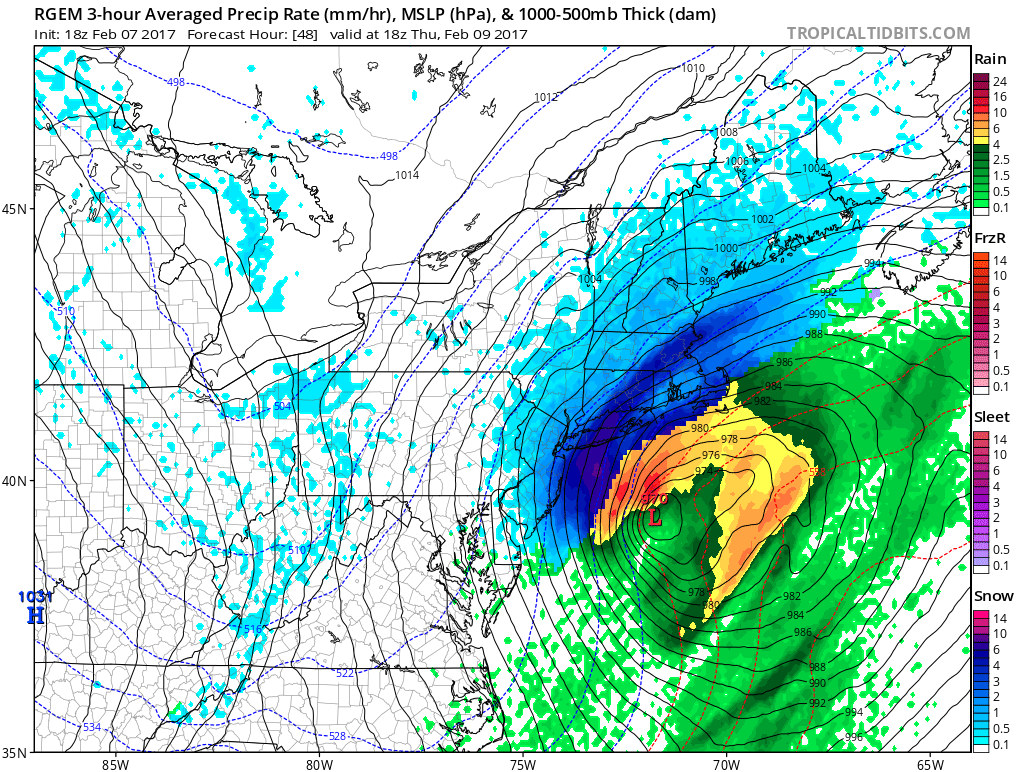 One of the models we want to watch closely is the Canadian RGEM model. This afternoon it painted a wrapped up intense storm to the south of Long Island and east of New Jersey coast. It likely represents the most extreme solution in that it would produce 1 foot plus snows for Long Island and near blizzard conditions. We aren’t forecasting this but we want to pay close attention to this model because it has a very good track record this winter. The dark blue most likely represents snow fall rates of several inches and hour as it is part of what is called the “comma” head. This is the most intense part of a cyclone and it has a signature comma shape on satellite pictures. The next model cycle will begin shortly and we will see whether other models trend in this direction. The latest National Weather Service snow forecast maps are below for our area and nearby.