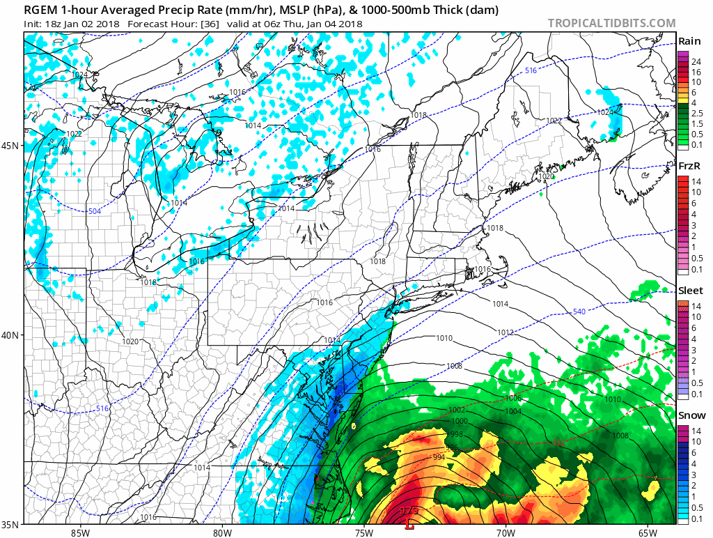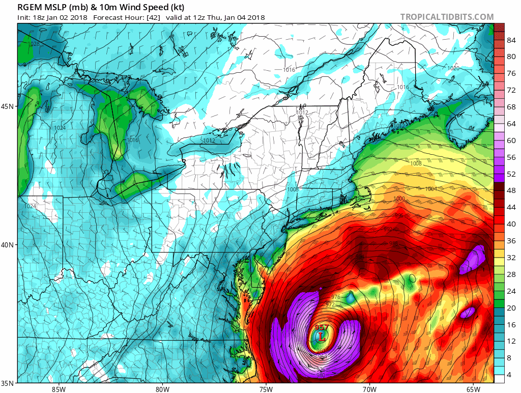 Take a look at how incredibly intense this storm gets with pressures as low as a category 3 hurricane. The radar shows a sledge hammer of snow over Suffolk county around midday Thursday. What probably keeps the snow accumulations from getting too out of hand is the fast movement so there won’t be a lot of time to put down crazy amounts.