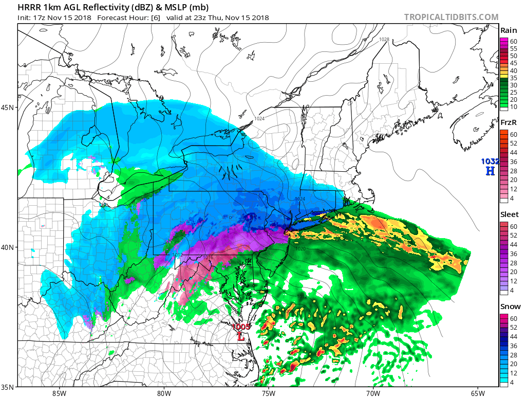 The snow is just about on the doorstep for Long Island. It may struggle to reach the ground initially, but flakes are likely, especially across Nassau and western Suffolk. A mix with and eventual change to all rain is likely for all, especially in Suffolk where you guys may have to wait until the next storm to get a first taste of snow this season. That is, unless you believe the HRRR model. HRRR stands for High Resolution Rapid Refresh. This is one of the few models that actually runs every single hour, and it is certainly able to depict more localized precipitation types. The latest run shows some heavy wet snow all across Long Island (sans maybe just the twin fork) as late as 6pm. With the sun down and a frigid 36 hours leading up to the event, it may be enough for some accumulating snow, if the bursts are hard enough.