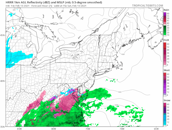The regional radars to the south are showing some snow developing on the northern flank. Observations show this snow is light however. Movement is northeastward. Look for the radars to rev up during the afternoon over New Jersey and then it moves overhead this evening and tonight. Temperatures are in the 20s and they will stay in the 20s through Sunday morning.